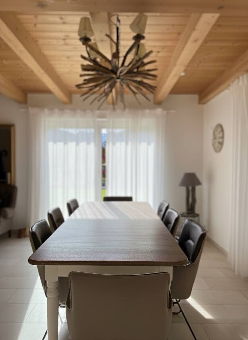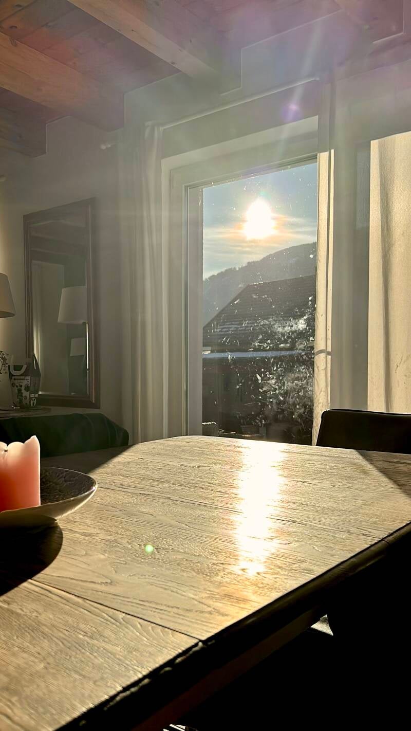 Vanaf de eettafel kijkt u rechtsreeks uit over de piste en in de ochtend schijnt het zonnetje heerlijk naar binnen door de ramen van de deuren die open kunnen en toegang geven tot het terras op het zuiden.